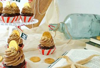 Pero, vamos con estos piratillas, a los que les ha encantado nuestros cupcakes de Ferrero Rocher. La idea no se me ocurrió de repente. Me ha llevado tiempo porque no sabía qué hacer. Pero me vino la idea de unos cupcakes donde el tesoro no sólo estuviera por fuera, en forma de moneda de oro, sino que también estuviera por dentro, enterrado en bizcocho. Un cupcakes con un bombón de Ferrero Rocher interior que sería una delicia, por dentro y por fuera.