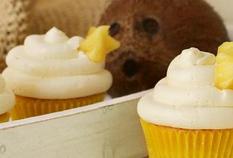 Unas magdalenas de coco y ron cubiertas por una SMBC (swiss meringue buttercream o crema de mantequilla de merengue suizo) de piña, coco y ron blanco.