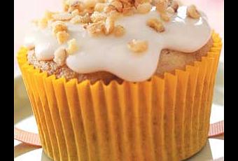 Para el frosting, en un recipiente pequeño, bata el queso crema y la vainilla hasta que quede suave. Incorpora poco a poco el azúcar glass. Untar en el frosting en los cupcakes, espolvorear con las nueces. Guarde en el refrigerador.