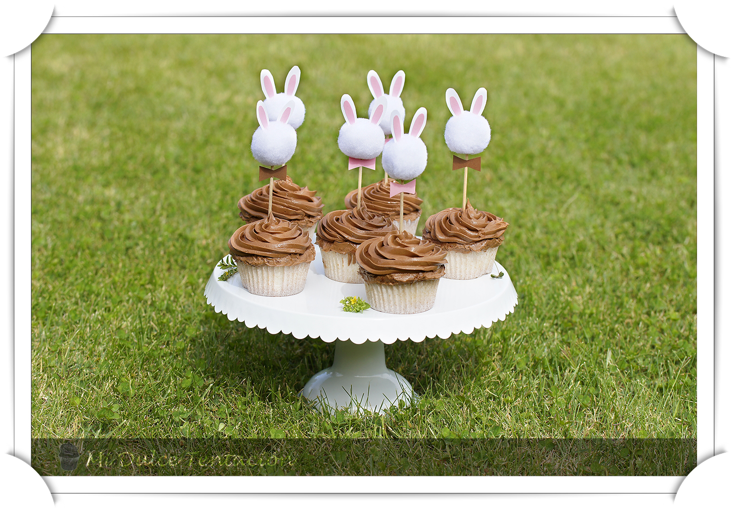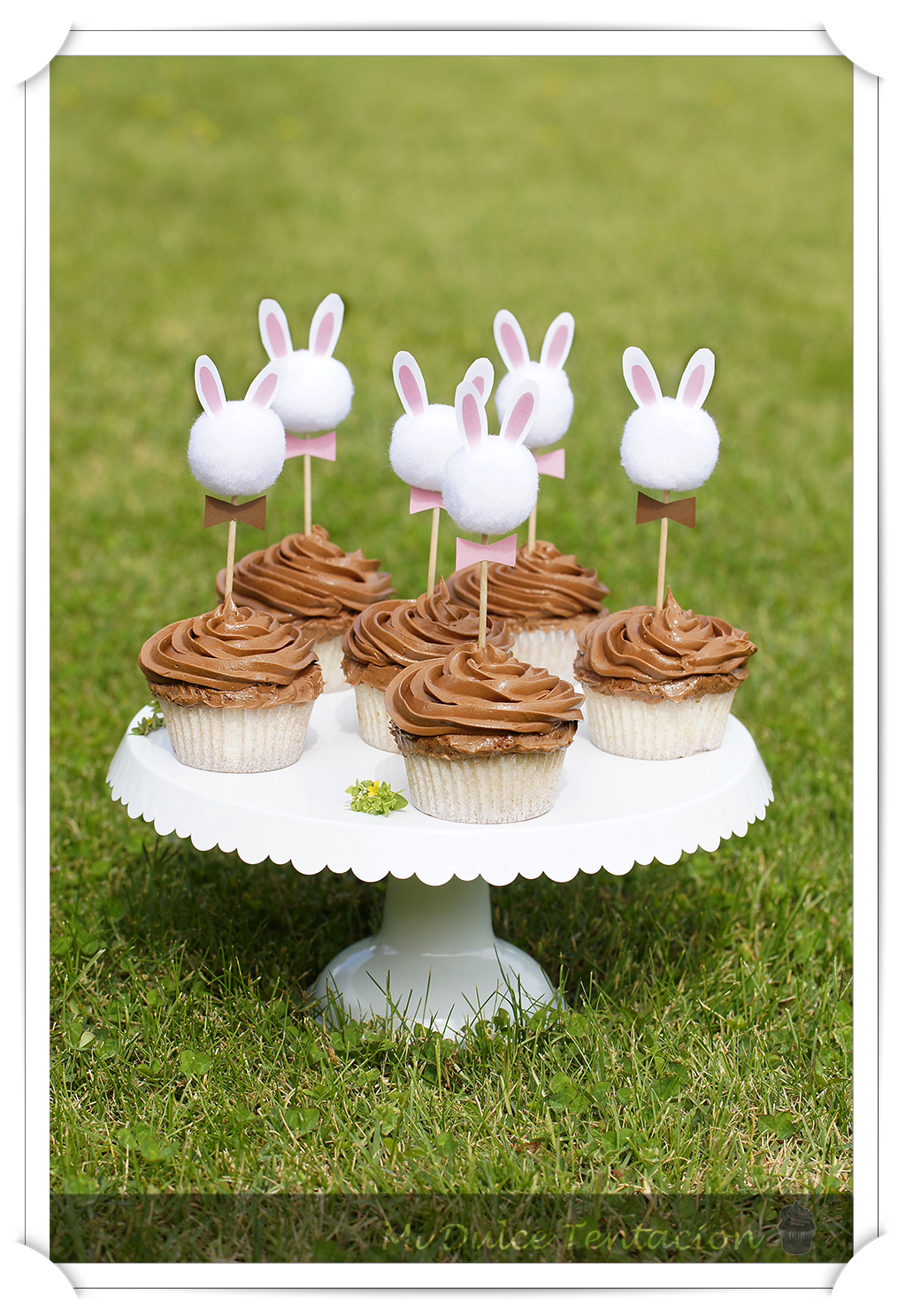 Ya os comenté que la temática fue Rabbit Party (fiesta de conejos) así que le hice unos toppers caseros para unos magníficos cupcakes con cuerpo de vainilla y frosting de chocolate intenso. El color que predominó en toda la fiesta fue el marrón y el rosa así que les puse unas pajaritas de estos colores y quedaron de lo más aparente. La idea la cogí de aquí y no pudieron gustarme más. Sencillísimos de preparar y preciosos a la hora de decorar.