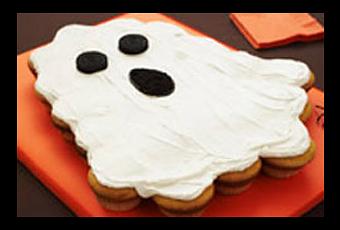 Arregle los pastelitos en un platón grande para servir o en la bandeja para darle la forma de fantasma, como se muestra en el diagrama. Untar con el frosting de queso de manera uniforme y ordenada. Use el glase negro para delinear solamente la boca al fantasma (no rellene). Tritura bien 3 de las galletas, espolvorear en el interior de la boca. Colocar las 2 galletas restantes para asemejarse a los ojos. Guarde en el refrigerador.