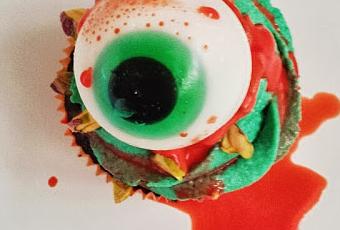 Para la decoración final necesitamos, golosinas monstruosas, unas 2 cucharadas soperas de nata montada (de la de bote), le añadimos colorante alimentario rojo WILTON, sobre ésta mezcla roja pondremos el ojo (lo venden en el lidl), decoramos con trozos de pistachos, a modo de dientes...