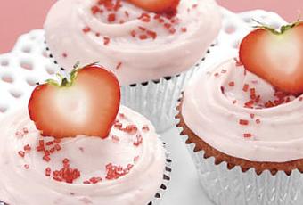 Coloque una cucharada de frosting sobre cada cupcake. Refrigere, cubierto, hasta que el frosting este firme, 20 minutos. Decorar con los sprinkles y las medias fresas.