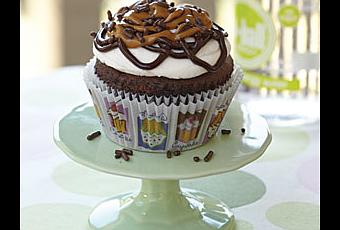 Rocíe cada cupcake con el rociado de café y el ganache de chocolate, espolvoree sprinkles de chocolate encima.