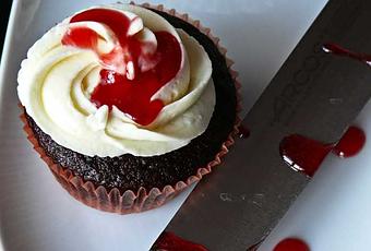 Nuestros cupcakes para halloween los hemos rellenado de sirope de fresa, no se lo hemos contado a nadie, así que al primer mordisco, esperamos ver alguna que otra cara roja.