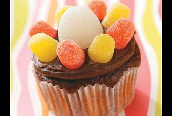 Untar el frosting en los cupcakes. Use un poco de frosting para unir las gomitas y/o malvaviscos a la parte superior de cada cupcake, formando una flor.