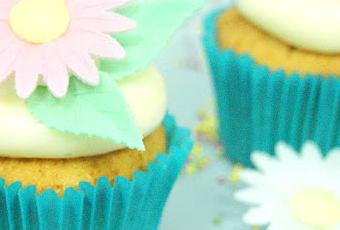 Cuando tengamos el frosting preparado lo pondremos en una manga pastelera y decoraremos los cupcakes. Inmediatamente despúes de esto, es el momento de colocar la decoración pues cuando el frosting se endurezca nos costará más trabajo. Nota: las flores están hechas con obleas.