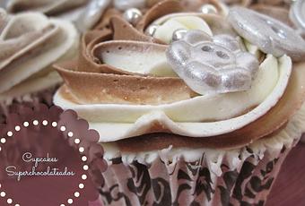 Untamos todas las cupcakes con una capita de crema ( da igual que chocolate useís) y decoramos con rosas de chocolate y botones de fondant