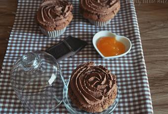 Con un descorazonador de manzanas, vaciar el centro de los cupcakes (que ya estarán fríos) y los rellenamos con mermelada de albaricoque. Volver a tapar con lo que hemos quitado. Poner la trufa en una manga pastelera con la boquilla que más nos guste (yo en este caso utilicé la 1M de Wilton y decorar los cupcakes.