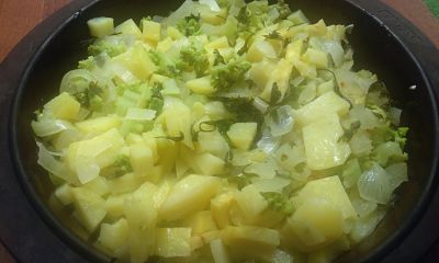 Pela y lava la patatas. Corta a cuadraditos. Pica la cebolla , limpia los tallos de romanesco y córtalos en trocitos pequeños. Ponlo todo en un recipiente apto para microondas, rocía con AOVE , pon sal, perejil picado y añade el ajo laminado.Remueve todo para que queden impregnados todos los ingredientes de aceite e introduce en el microondas durante 10 minutos a máxima potencia. Saca , remueve y vuelve a introducir otros 10 minutos más.