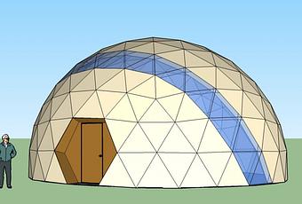Vista exterior sureste de la cúpula geodésica que albergará el gimnasio. Las ventanas siguen el recorrido del sol en un día de otoño proyectado sobre la cúpula