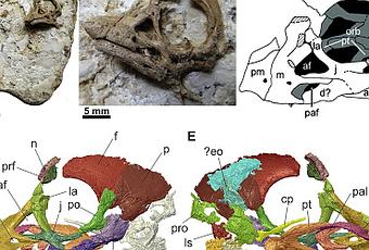 Fotografías del fósil (A) y cráneo (B) del embrión. En C se aprecia un dibujo técnico del mismo y en D y E modelos tridimensionales generados con tomografías. Los colores indican diferentes huesos. Tomado de Kundrát et al. (2020).Y recientemente se ha publicado lo que quizá sea el cambio ontogenético más radical descubierto en cualquier dinosaurio. Al menos hasta la fecha. Se trata de un embrión fósil de titanosaurio indeterminado que muestra un cráneo con características más que peculiares. Para empezar, presenta una especie de "punta" en el hocico que se conforma de prolongaciones del premaxilar. En esta parte se hipotetiza que existió un recubrimiento córneo (un cuerno, vaya) llamado cuerno premaxilar.