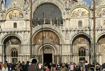 Fundada en el 828 para honrar la memoria de San Marcos, el Evangelista, es un edificio de influencia bizantina y ya en el exterior se aprecian esculturas y mosaicos, la puerta de bronce de la fachada, pilastras sirias y en el lado sur un grupo de Tetrarcas (cuatro personas que comparten el poder).