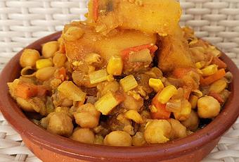Curry de garbanzos con yuca2 tazas de garbanzos cocidos2 tazas de trozos de yuca1/2 taza de maíz dulce1 zanahoria1 cebolla4 tomates1 tallo de apio2 dientes de ajo1 cdta de curry en polvo1 cm de jengibre fresco1/2 cdta de cúrcuma2 tazas de caldo vegetal1 cda de aceitesal