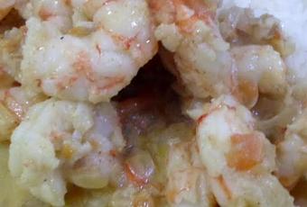 Por último le agregamos 1/2 de crema o nata de leche, ya que leche de coco no conseguí.y cuando rompe el hervor agrego los langostinos, camarones, gambones, gambas en la salsa y dejo cocinar unos 5 minutos. Como ya están precocidos los langostinos solo se necesita calentarlos. Y listo para poder degustarlos!