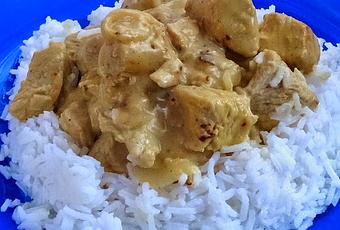 - El día anterior poner en un bol 1 kg de muslo de pavo deshuesado y troceado, sal, pimienta, 1 cuch de curry, 2 yogures naturales y el zumo de 1 limón. Mezclar bien, tapar y dejar marinar en la nevera hasta el día siguiente.