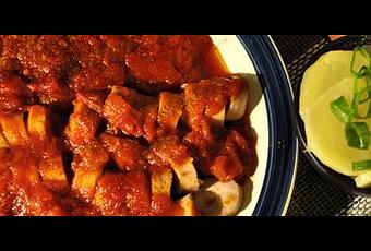 Básicamente es una salchicha cocida o a la plancha acompañada de una salsa de tomate con curry cuyo ingrediente principal es…¡el ketchup!