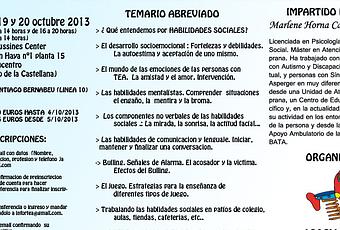 Madrid 19 y 20 de Octubre de 2013 :El día 19 de 10 a 14 horas y de 16 a 20 horas y el día 20 de 10 a 14 horas.CONTENIDOS:*¿Qué entendemos por habilidades sociales? Comprendiendo la complejidad de las interacciones sociales y sus diversos componentes.* El desarrollo socioemocional en las personas con TEA. Evolución en la conciencia de las propias dificultades. Conocimiento de las propias fortalezas y debilidades. Mejorando la autoestima y aceptación de uno mismo. La comunicación o no del diagnóstico a terceros.* El mundo de las emociones en personas con TEA. Atracción hacia las emociones. Percepción de emociones. Expresión de emociones. Comprensión de emociones. La amistad y el amor (la diferencia entre amistad y pareja, la sexualidad, dificultades en las relaciones de pareja). Fases y estrategias de intervención. Recursos educativos y diseño de materiales adaptados para trabajar las emociones: termómetro de emociones, etc.* Las habilidades mentalistas. Comprender situaciones de engaño, mentira y broma. Entender y resolver malentendidos. La importancia de tener en cuenta el contexto de las situaciones. Las “mentiras piadosas”. La importancia de los comentarios empáticos. Hacer alabanzas y cumplidos. Aceptar o rechazar críticas. Respetar los derechos de los demás. Estrategias prácticas para su comprensión e intervención desde casos prácticos: Comics en forma de historieta e Historias Sociales de Carol Gray, Autopsias sociales, la Balanza de la Justicia de Tony Attwood, etc.* Los componentes no verbales de las habilidades sociales: la mirada, la sonrisa, la expresión facial, la postura corporal, la distancia personal, la apariencia personal, los gestos, el contacto físico. Estrategias prácticas para su comprensión e intervención desde casos prácticos.*Las habilidades de comunicación y lenguaje: Iniciar, mantener y finalizar una conversación. Saludar y despedirse. Pedir permiso. Pedir ayuda o información Saber rechazar. Aceptar y pedir favores. Pedir disculpas. Avisar, ofrecer e invitar. Entender los actos de habla indirectos. Las metáforas e ironías. Hacer comentarios relevantes. Estrategias prácticas para su comprensión e intervención desde casos prácticos.* Bullying. ¿Qué es?. Situaciones y entornos. Señales de alarma. El acosador y la víctima. Efectos del bullying en personas con AAF y Síndrome de Asperger. Estrategias de afrontamiento desde el centro, los compañeros, la familia y la persona. La autodefensa de sus derechos.* El juego. La importancia del juego para el desarrollo de la afectividad, imaginación, mentalismo, comprensión social, lenguaje y ocio. Fases en el desarrollo del juego. El juego en personas con autismo y discapacidad intelectual asociada. Estrategias para la enseñanza de los diferentes tipos de juegos. El juego con pares.* Trabajado las habilidades sociales en entornos naturales. Una propuesta de intervención imprescindible. Trabajando con entornos, compañeros y demás agentes. Ejemplos prácticos de intervención en entornos naturales: en patios de colegio, dentro de las aulas, en tiendas, cafeterías, transportes públicos, espacios de ocio, etc.http://autismodiario.org/eventos-3/curso-habilidades-sociales-en-personas-con-autismo-y-discapacidad-intelecual-autismo-de-alto-funcionamiento-y-sindrome-de-asperger/