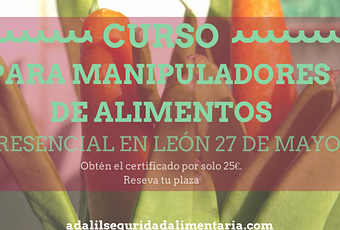 Curso presencial para manipuladores en León, el día 27 de mayo a las 5 de la tarde. Precio 25€.