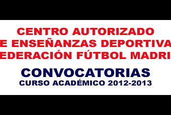 CURSO TÉCNICO DEPORTIVO EN FÚTBOL GRADO MEDIO PRIMER NIVELCuadernillo convocatoria (5 noviembre 2012 - 30 mayo 2013)Sede FFM - HORARIOSede Alcorcón - HORARIO CURSO TÉCNICO DEPORTIVO EN FÚTBOL GRADO MEDIO SEGUNDO NIVELCURSO TÉCNICO DEPORTIVO EN FÚTBOL GRADO MEDIO SEGUNDO NIVELCuadernillo convocatoria (14 enero 2013 - 30 mayo 2013)Sede Alcobendas - HORARIOSede Leganés - HORARIOXCURSO FEDERATIVO 2012-2013CURSO FEDERATIVO ENTRENADOR TERRITORIAL FÚTBOL - NIVEL 2Cuadernillo convocatoria (5 octubre 2012 - 20 mayo 2013)Sede Alcalá y Torrejón - HORARIOEn todos los cursos se entrega ropa deportiva para las prácticas