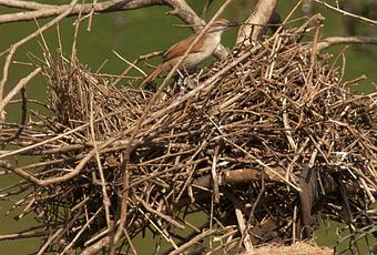Este Curutié colorado fue muy astuto a la hora de la elección del lugar para construir su nido en la Reserva del Arroyo Itá; hoy por hoy el medio del arroyo constituye el lugar mas seguro de la reserva ya que aquí nadie lo molesta. Comparto esta secuencia de fotos obtenidas el 26 de Septiembre pasado donde se lo puede ver en plena tarea de construir su nido sobre una plataforma de ramas reforzadas por basura flotante, la que desgraciadamente en ocasiones abunda en este lugar.