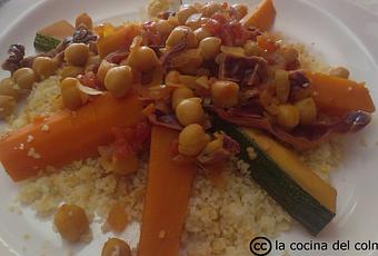 125 g de sémola de trigo (mejor integral)1 zanahoria1 trocito de calabaza1/2 calabacín1/2 nabo1 cebolla2 tomatesUnas hojas de repollo o lombarda1/2 bote de garbanzos cocidos (o uno entero de los pequeños)1/2 cucharadita de cúrcuma1/2 cucharadita de jengibre en polvo1/2 cucharadita de pimentón1/2 cucharadita de comino1 pizca de pimienta negraSal marina atlánticaUn chorrito de aceite de olivaUn puñado de pasas1 cucharadita de canelaAguaPREPARACIÓNPelamos y picamos la cebolla y los tomates. Lo dejamos apartado en un plato. En una cazuela, ponemos un chorrito de aceite y añadimos la cúrcuma, el jengibre, el pimentón, el comino y la pimienta. Debemos tener cuidado de que el aceite no esté muy caliente o las especias se nos quemarán. Removemos y añadimos las cebollas, los tomates y la sal, reservando una cuarta parte de la cebolla. Rehogamos y cubrimos con agua. Dejamos que hierva a fuego medio. Lavamos la zanahoria, la calabaza, el nabo, el calabacín y el repollo y los cortamos en sentido longitudinal. Reservamos en un plato.En una fuente, colocamos la sémola de trigo. Rociamos la sémola con un poquito de aceite de oliva y aplastamos con la mano. Cubrimos con agua y dejamos reposar 20 minutos. Cuando esté seca, la ponemos en un colador.Añadimos a la cazuela las verduras más duras (nabo, zanahoria y calabaza). Ponemos el colador con la sémola encima de la cazuela, tapamos y dejamos cocer 15 minutos. Transcurrido ese tiempo, retiramos el colador y añadimos el calabacín y el repollo, dejando que se cocine unos 8 minutos más. Preparamos un pequeño tazón con agua con sal. Colocamos la sémola en una fuente y salpicamos con el agua con sal. Removemos y dejamos reposar unos minutos. Esta operación debe realizarse 3 veces (15 minutos al vapor - salpicar con agua con sal - reposo --- 15 minutos al vapor - salpicar con agua con sal --- reposo --- 15 minutos al vapor - salpicar con agua con sal - reposo), pero nosotros sólo lo hacemos una vez. Cuando lo hemos hecho las 3 veces, la sémola nos ha quedado muy blanda y pegajosa...Incorporamos a la cazuela los garbanzos ya cocidos y apagamos el fuego.En una sartén ponemos la cebolla picadita que habíamos reservado, la canela, una pizca de sal y un poco de agua. Dejamos que caramelice. Añadimos las pasas y dejamos hervir hasta que se consuma el agua.En un plato ponemos la sémola, añadimos las verduras con los garbanzos, salsita al gusto y una cucharada de la mezcla de pasas y cebolla.En esta ocasión, la lombarda nos ha quedado de una forma y color que recuerda al jamón serrano, pero el sabor nada que ver, ¿¡eh!? Jejejejeje