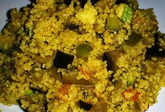 Calentamos un vaso de agua y se lo añadimos al cuscús que lo tendremos en un plato hondo, removemos bien durante unos minutos con un tenedor. Añadimos las verduras, un poquito de sal y una cucharadita de ras hanout. Mezclamos todo bien y servimos.