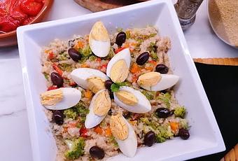 Para hoy tengo un plato ligero y sabroso. Se prepara en menos de media hora y lo podéis hacer para cualquier día de la semana.La receta de hoy aguanta 2 o 3 días en la nevera, se pude comer fría o templada y sigue estando igual de buena.¿Sabías qué? El cuscús o cous cous es un plato de la cocina árabe que se elabora con sémola de trigo. Es rica en proteína y aporta mucha energía. Baja en colesterol, baja en sodio y rica en vitaminas. Cuscús integral