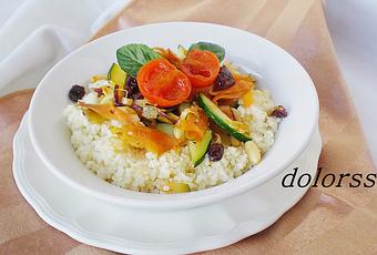 Ingredientes para 4 personas:300 gr. de cuscús6-8 tomates cherry1 cebolla1 puerro1 calabacín2-3 zanahorias2 c/s de pasas1 c/s de piñonesUna pizca de comino, pimentón dulce, pimienta de cayena, salaceite de oliva virgen extra Poner las pasas en remojo con un poco de agua. Proceder a preparar el cuscús siguiendo las indicaciones del fabricante.