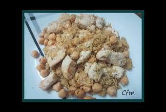 -100 gr de garbanzos cocidos-100 gr de cuscús-Caldo de pollo-1 pechuga de pollo-1/2 cebolla-1 cucharadita de Ras el-hanout-5 ó 6 hojas de hierbabuena-1/2 limón, el zumo y la ralladura-1 nuez de mantequilla