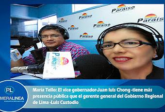 Opina –periodista María Tello al cuestionar al gerente general del Gobierno Regional de Lima. Desde su programa Enfoques” de radio Paraíso –recordó que los consejeros regionales también están expuestos la revocatoriaPara la periodista María Tello Reyes – lo que el Gobierno Regional de Lima (GORE LIMA) – tiene por gerente general –no ata ni desata en la gestión que lidera el gobernador – Nelson Chui Mejía.