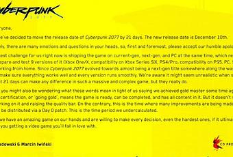 Anuncian que la salida del vídeojuego se retrasa otros 21 días y la fecha de lanzamiento pasa al 10 de Diciembre de este año. Parece que el tema se ha complicado un poco mas de la cuenta y entre Covid y demás, ni haciéndoles "Crunch" a los desarrolladores y testeadores no van a poder evitar ese retraso. Además están intentando cuadrar el lanzamiento de las 9 versiones del juego (Una por cada plataforma) para que salgan al mismo tiempo, algo por otro lado, esperable y lógico.