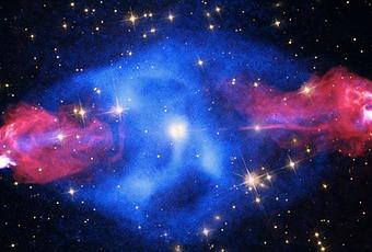 la imagen de rayos X revela "manchas calientes" que sugieren la localización en la que los chorros de partículas son detenidos en los alrededores de un gas más frío y denso. La imagen de rayos X muestra también que los chorros han producido una gran cavidad en el gas circundante. Las brillantes franjas de emisión en el interior de la cavidad parecen indicar material caliente de rayos X arremolinándose en torno al centro del agujero negro situado en el centro de la galaxia.