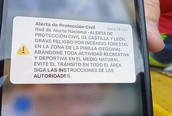 Protección civil y Emergencias de la Junta de Castilla y León ha enviado un mensaje a teléfonos móviles a través del sistema ES-Alert para recomendar la suspensión de actividades al aire libre en la zona de La Pinilla (Segovia) a causa del incendio forestal de Peñalba de la Sierra (Guadalajara).