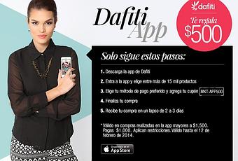 Si me siguen por FB y Twitter, ya les había comentado de la nueva App de Dafiti para hacer compras mediante sus dispositivos móviles. La buena noticia es que pueden obtener un descuento de $500 MXP en las compras que realicen mediante la aplicación. Para probarla sólo den click a la imagen y felices compras!!!