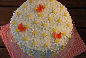 Por último decoramos con margaritas hechas con fondant (las margaritas conviene hacerlas el día anterior para que el fondant no esté blando).