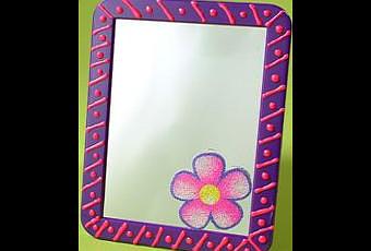 Pegamos el marco en la superficie del espejo, y decoramos con la pintura dimensional (también podríamos usar las gomas con glitter de diferentes colores que vienen en tubitos). Pegamos el sticker elegido en una de las esquinas del espejo, y dejamos secar bien todo el trabajo.