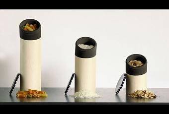 La serie de contenedores, construidos en aluminio y madera, están disponibles en tres tamaños, para almacenar diferentes tipos de alimentos secos (azúcar, arroz, té, frutos secos, etc.).