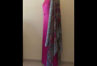 Sin mangas y con una boda en el campo, había que cubrir de alguna manera, me trajo una seda finísima, maravillosa y estampada para pensar cómo añadirla. La solución fue poner un adorno de pedrería con un automático camuflado en el hombro y en el chal, un automático en el medio, respetando toda el largo de la tela y sólo haciendo un leve pespunte, quedaba una maravillosa capa que podía engancharla con el botón y ponerla alrededor de los hombros o cayendo sobre el hombro a un lado del cuerpo.