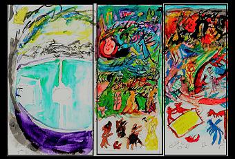 -Ah. Los tripticos. Son ventanas de conventillos famosos con persianas y todo. Pero "El triunfo del Calavera" no es un triptico, a semejanza del original. La vieja Bruguel pinto en lo que tenia a mano:Una tabla de lavar. Vea como los calaveras desdeñan a los reos mugrientos y van metiendo a los que se creen bailarines virtuosos en una caja donde les esperan horribles tormentos. Toda una declaración de intenciones.