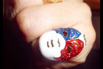 Os enseño mi nuevo anillo, es una máscara con un antifaz de colores azul y rojo. Tiene esos colores tan fuertes que se puede hacer una manicura a juego y lucir unas bonitas manos muy bien adornadas.