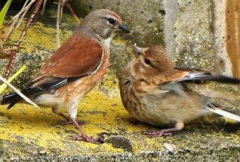 Precisamente un pequeño grupo familiar de esta última especie estuvo un buen rato cerca de nosotros, compuesto de papá pardillo y tres pollos volanderos, que como cualquier joven recien emancipado del hogar paterno pedían comida a su progenitor de forma continuada. Éste de vez en cuando no tenía más remedio que atender a tanta insistencia, depositando la comida en sus picos de forma delicada. Por desgracia, la foto más interesante y que muestra este precioso momento me quedo borrosa...