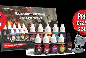 Junto con este set, tenemos el D&D Adventurers Paint Set por 22,50 euros (Muy parecido a este de la Suboscuridad), D&D Monsters Paint Set por 69,99 euros (36 botes formados por 29 pinturas acrílicas, 3 pinturas metalizadas, 3 lavados de tinta y 1 efecto, mas una figura de Oso Búho) D&D Nolzurs Marvelous Brush Set por 9,99 euros (Interesante) el D&D Nolzurs Marvelous Pigments Bundle por 102.48 euros y cuatro botes exclusivos de pintura por 2,25 euros cada uno: