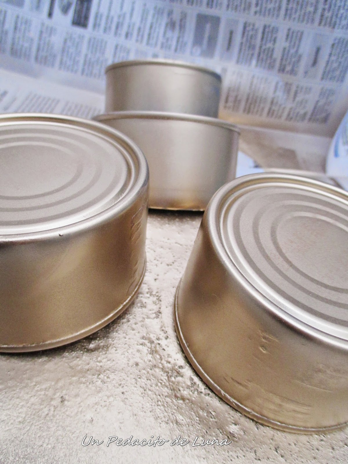 Guardé unas cuantas latas de carne de mi Blacky que, con un buen tamaño, se prestaban para mi idea.....Y pasaron de latas "cenicienta" a princesas doradas con un baño de spray.