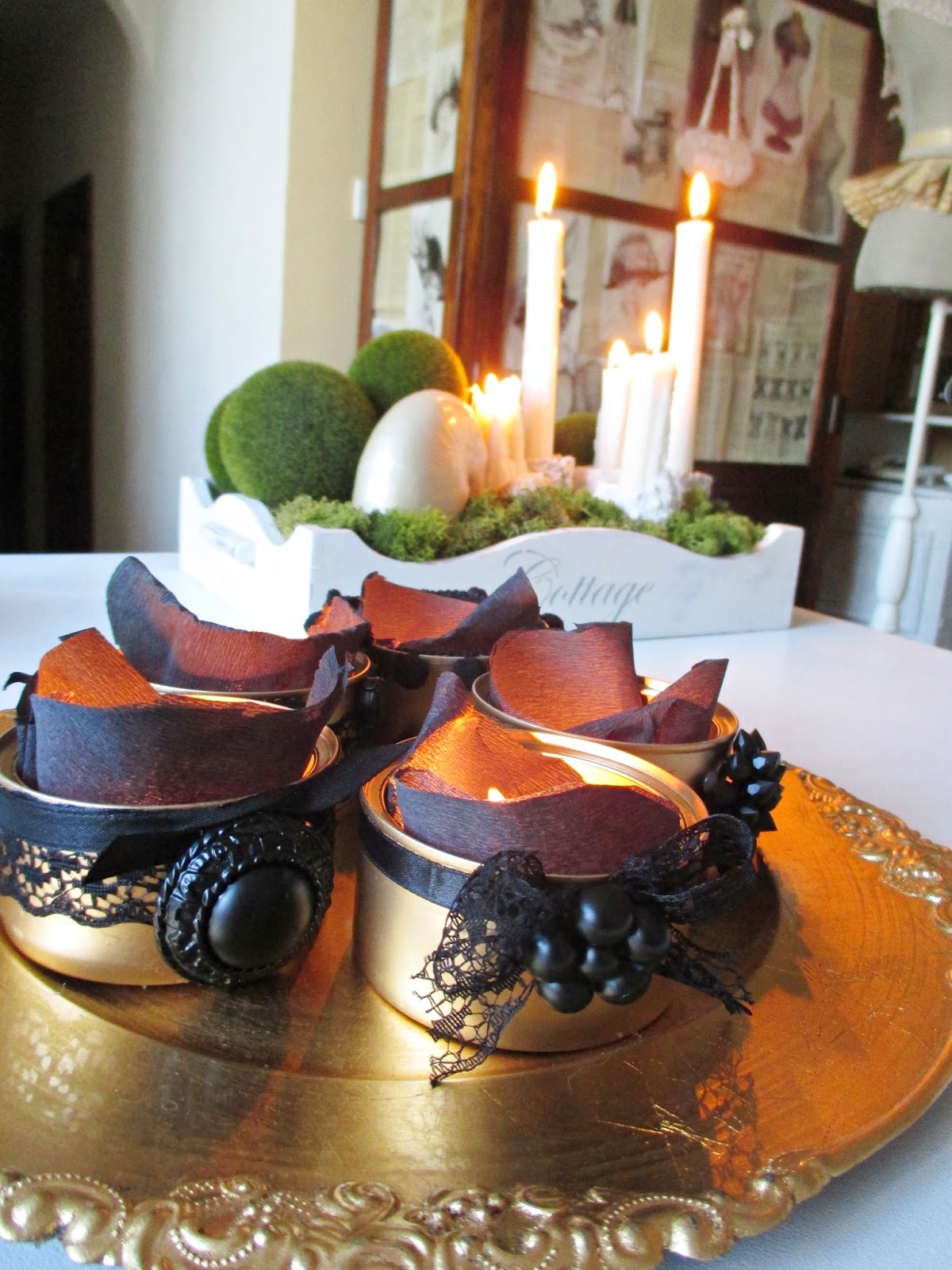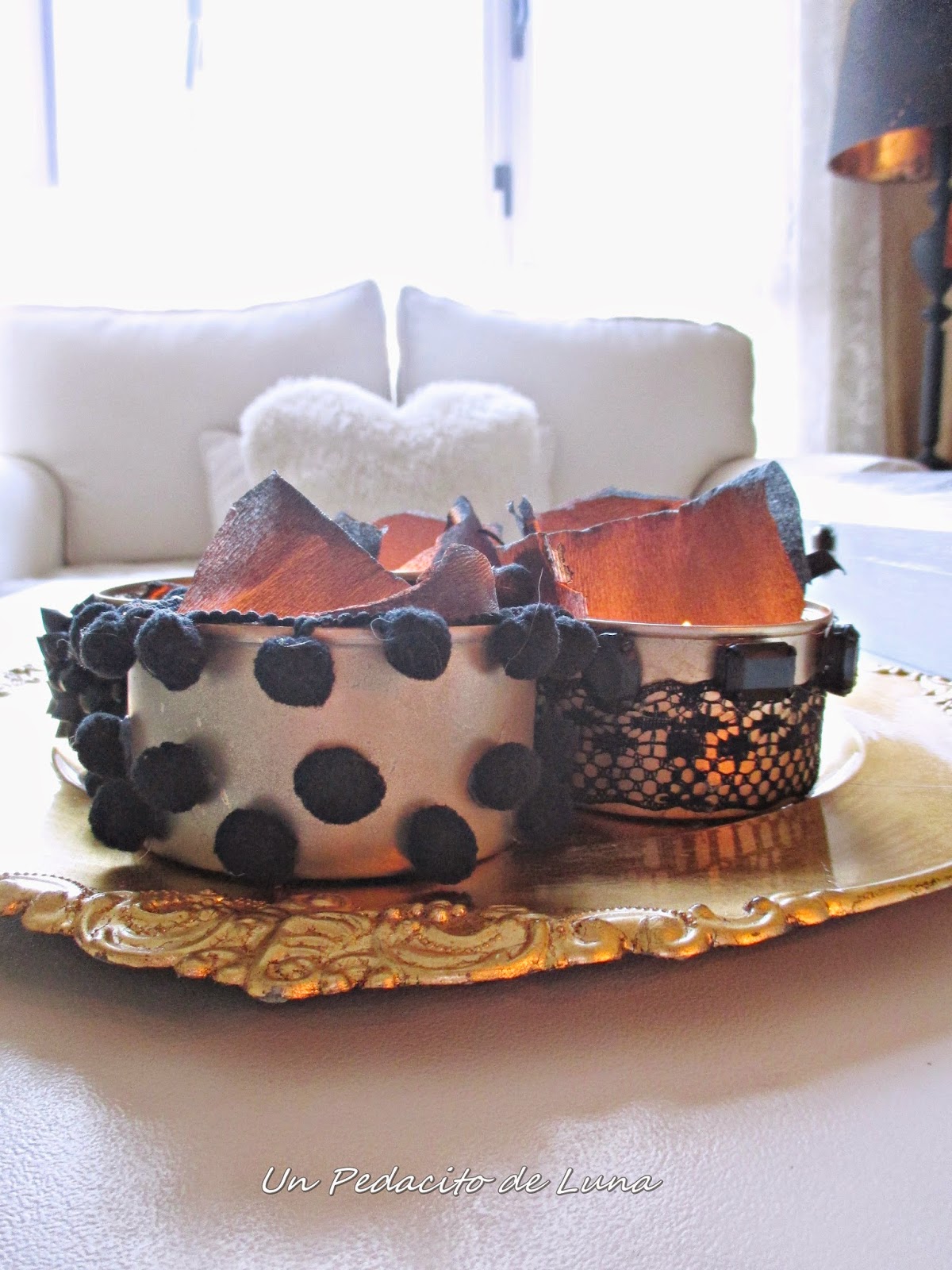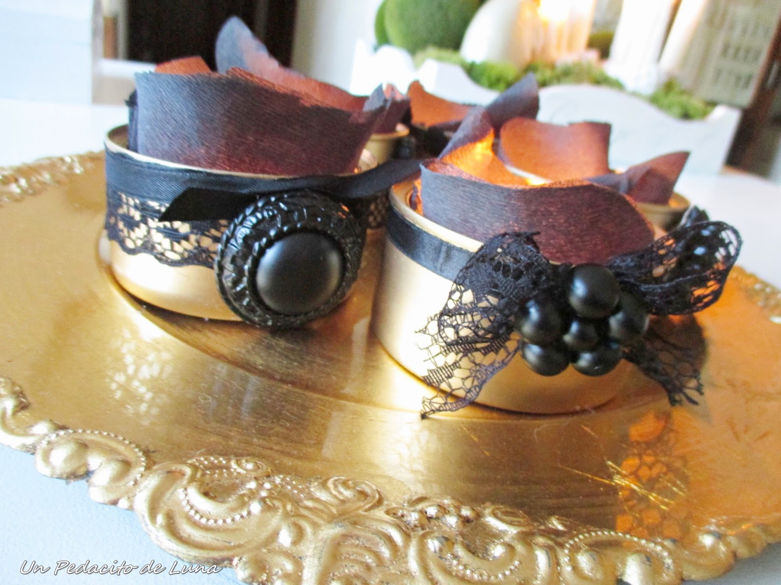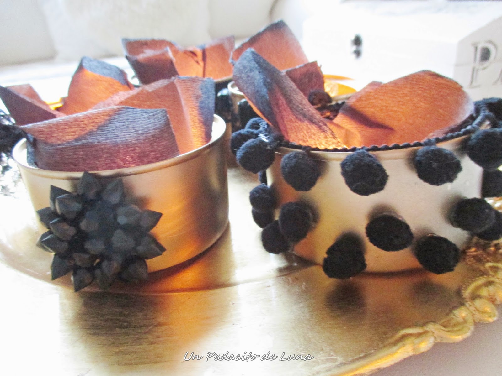 Si en principio la idea del papel negro para decorar el interior con las velas me pareció ideal, lo cierto es que en alguna de ellas terminó quemándose dentro de la lata, así que mejor evitar riesgos!!