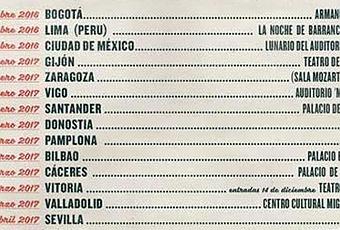 Después de los tres conciertos en Latinoamérica que tendrán lugar el próximo mes de noviembre, el artista emprenderá una extensa gira de conciertos por teatros y auditorios emblemáticos de toda la geografía española en los que, acompañado de toda su banda, tocará en directo su último disco sin olvidar los temas más representativos de su carrera en solitario y algún que otro guiño al pasado.