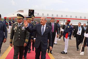 El presidente Danilo Medina regresó al país, a las 5:53 de la tarde, por la Base Aérea de San Isidro, procedente de Guatemala, luego de concluir su participación en la LIII Reunión de Jefes de Estado y de Gobierno del Sistema de Integración Centroamericana (SICA).