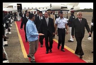 La llegada del Jefe del Estado se produjo por la terminal de la Base Aérea de San Isidro, en el avión de matrícula norteamericana N604MC, en el que le acompañaron de los ministros de la Presidencia, Gustavo Montalvo, y Administrativo de la Presidencia, José Ramón Peralta, así como de su asistente personal Carlos Pared Pérez.