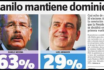 La publicación de la última encuesta Gallup-Hoy, en la que la población votante otorga el 63% al candidato presidencial Danilo Medina, del PLD y aliados, contra un 29% del opositor Luis Abinader, del PRM y aliados, deja más claro que el agua cristalina que a 20 días para los comicios del 15 de mayo todo está consumado a favor de Medina, quien lejos de decrecer en popularidad podría ascender entre dos o tres puntos más, conforme el comportamiento de la intención al voto de los últimos tres meses.