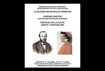 Hoy, Lorenzo Bartoli trató las poéticas de la culpa en las obras de Dante y Dostoievsky en la Universidad Complutense de Madrid. Bartoli ya ha trabajado este tema respecto de Dante en el libro Dante total, publicado por el Círculo de Bellas Artes. Dostoievsky es condenado a muerte en 1849 por conspirar contra el Zar. Su pena es condonada por la cárcel en Siberia. A partir de esta experiencia, la culpa es un tema central de su novelística. En Memorias de la casa muerta (1861) ficcionaliza sus experiencias en presidio y da origen a la literatura de concentración rusa, que trata sobre la prisión. Tal como está recogido en sus cuadernos, Dostoievsky empieza a escribir Crimen y castigo (1866) en primera persona. Luego, decide escribirlo en tercera para que el narrador pueda reflexionar sobre la culpa del protagonista. Por su parte, Dante fue condenado a muerte en 1302 y debe exiliarse de Florencia. El exilio se convierte en un motivo central de La divina comedia.